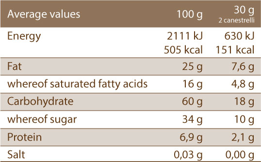 A traditional speciality made with shortcrust pastry, the classic Canestrelli are also available in another version enriched with butter in the dough of this typical product of Ligurian confectionary. Made with carefully selected ingredients, they maintain their characteristic shape and inimitable mouth-watering crumbliness which always distinguishes them and makes this tasty speciality unique. The butter Canestrelli are also available in this delicious versions with chocolate chips. Only eggs from free-range hens are used in this product.