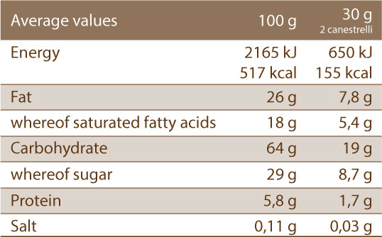 A traditional speciality made with shortcrust pastry, the classic Canestrelli are also available in another version enriched with butter in the dough of this typical product of Ligurian confectionary. Made with carefully selected ingredients, they maintain their characteristic shape and inimitable mouth-watering crumbliness which always distinguishes them and makes this tasty speciality unique. The butter Canestrelli are also available in other delicious versions with chocolate chips and with “piedmont hazelnut”. Only eggs from free-range hens are used in this product.