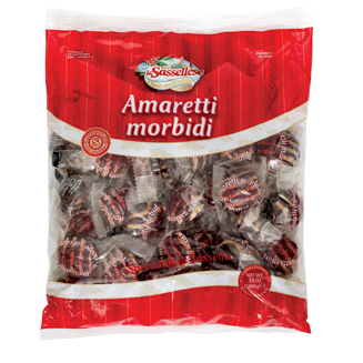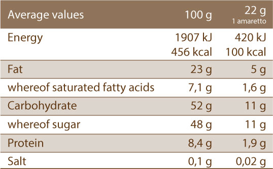 By combining delicious chocolate with the unmistakable gently bitter flavour of the Soft Amaretto, an exquisite confectionary speciality is created. It unites a tasty touch of innovation with the respect of the age- old traditional recipe. Individually wrapped, the Soft Amaretti with chocolate stripes are distinguished by the scrupulous selection of raw materials, guaranteeing a product of the highest quality and totally gluten- free. The best almonds, apricot kernels, white of egg and sugar, in full compliance with the provisions of the Ministerial Decree of 22 July 2005, which protects the most renowned specialities of the Italian confectionary tradition. Ingredients of the highest quality, bring to life a delicious little masterpiece, whose goodness and fragrance remain unchanged for all the durability of the product thanks to a careful and accurate production process. Only eggs from free- range hens are used in this product.