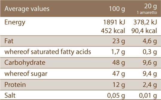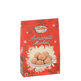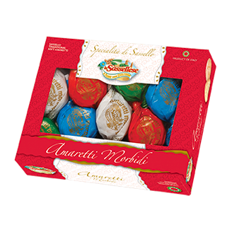 Our Soft Amaretto is created through the respect for the age-old traditional recipe, it is a product of the highest quality, guaranteed by the scrupulous and careful selection of raw materials and it is totally gluten-free. Only ingredients of the highest quality are used in the making of this delicious pastry: the best almonds, apricot kernels, white of egg and sugar, in full compliance with the provisions of the Ministerial Decree of 22 July 2005, which protects the most renowned specialities of the Italian confectionary tradition. Only eggs from free-range hens are used in this product. Our Soft Amaretti are the result of a delicate and careful production process that, for the entire shelf life of the product, maintains unchanged the unique characteristics of quality, genuineness and fragrance which make inimitable this exquisite speciality. From the rolling phase, when the dough is placed in small portions on the baking tray, to the wrapping of each individual Soft Amaretto, each careful step contributes to obtain this small, traditional delight with a slightly flattened, round shape, covered by a dusting of sugar whose fragrance is released during baking. It holds a soft and scented centre with its characteristic gently bitter flavour.