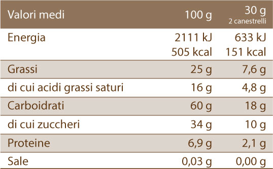 farina di frumento, burro (22%), zucchero, gocce cioccolato (10%) (zucchero, burro di cacao, latte intero in polvere, pasta di cacao), albume e tuorli d’uovo*. Può contenere tracce di nocciole. *Uova da galline allevate a terra.